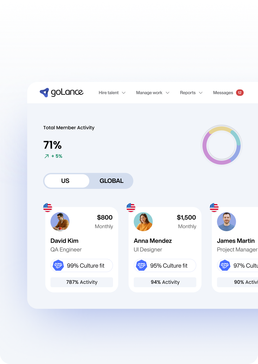 Ensure accurate, timely payroll in all 50 states while optimizing team performance. Manage benefits administration, HR, and workforce optimization from one unified platform. goLance US Payroll instantly calculates payroll taxes, syncs direct deposits and payslips with your accounting software, and provides cultural alignment insights—all with full compliance across every state. Transform payroll from compliance necessity to competitive advantage.